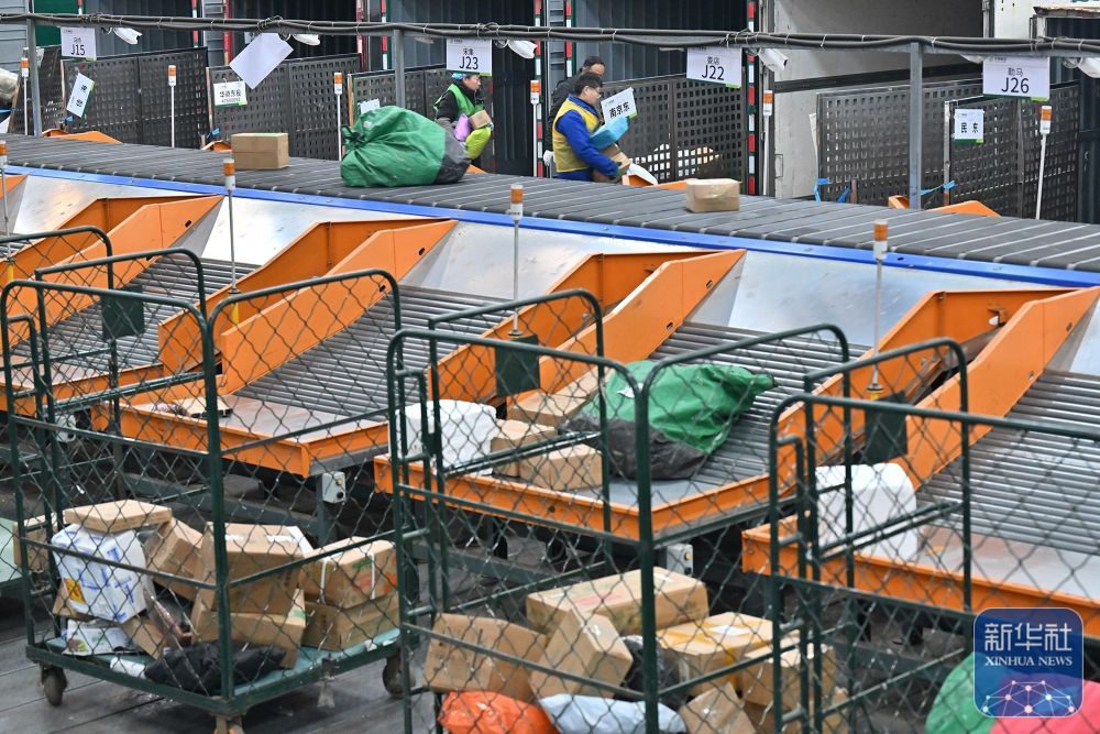 ↑1月2日,中国邮政集团有限公司商丘分公司邮件处理中心的快递工作人员。新华社发(李恒供图)