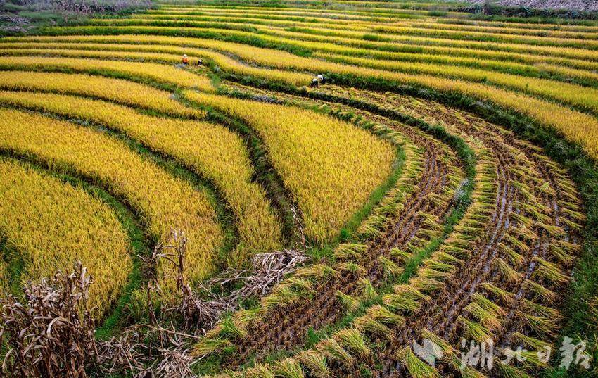 湖北日报客户端讯(通讯员李传书、崔杨通讯员)利川在恩施县被誉为“银利川”,主要是因为盛产水稻。每年秋天,稻子成熟的时候,田野在阳光下闪闪发光。风一吹,金色的稻浪起起落落,所有的田地都变成了金色的稻田。在这个收获的季节,田野里充满了收割机的轰鸣声和桶里粮食撞击的声音,丰收的景象在田野里蔓延开来。
